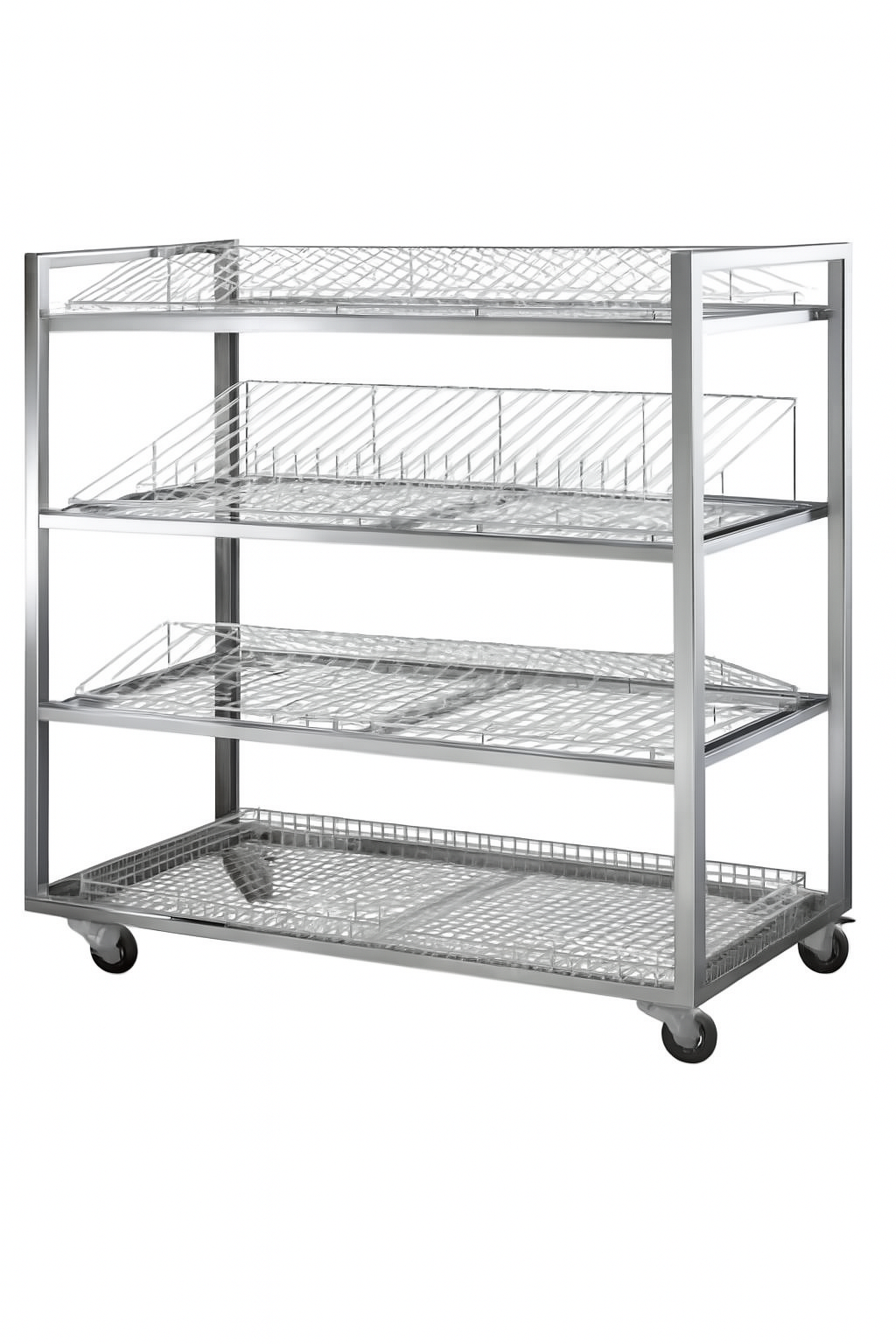 - طراحی ارگونومیک: ارتفاع مناسب، طبقات مشبک برای خروج آب، و دستههای راحت برای هدایت ترولی.