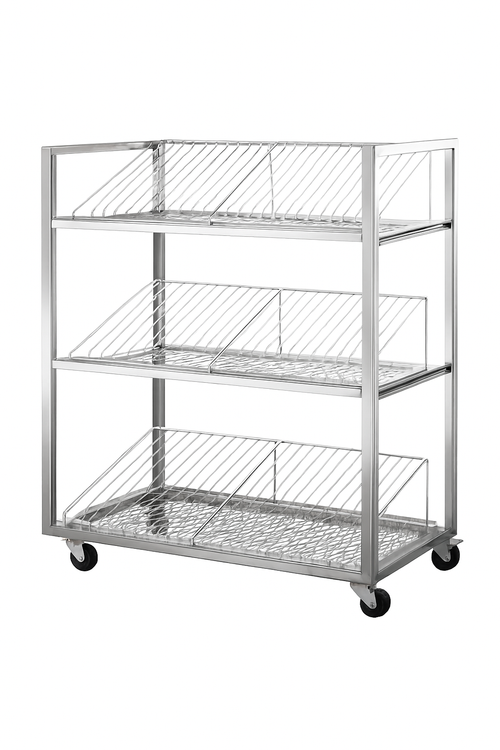 - طراحی ارگونومیک: ارتفاع مناسب، طبقات مشبک برای خروج آب، و دستههای راحت برای هدایت ترولی.